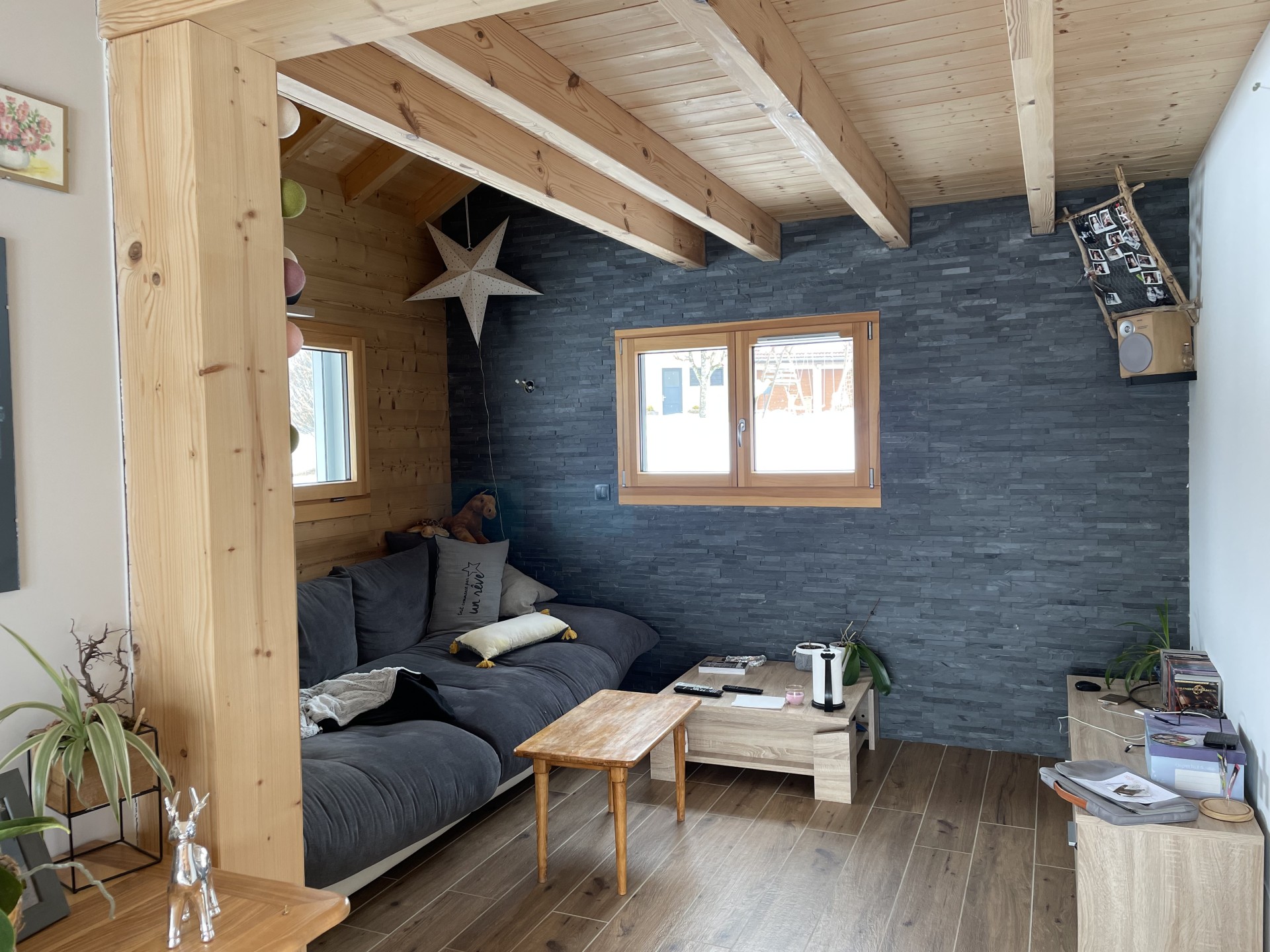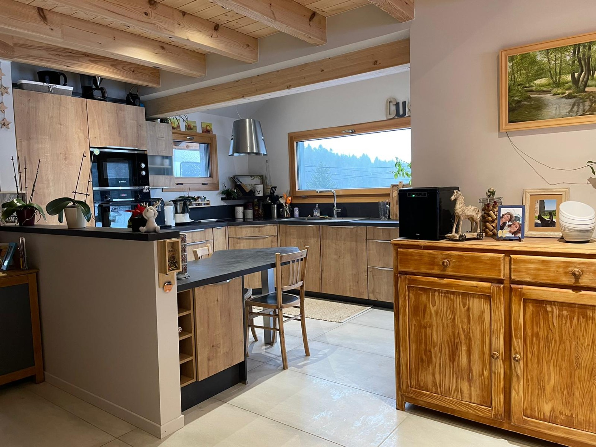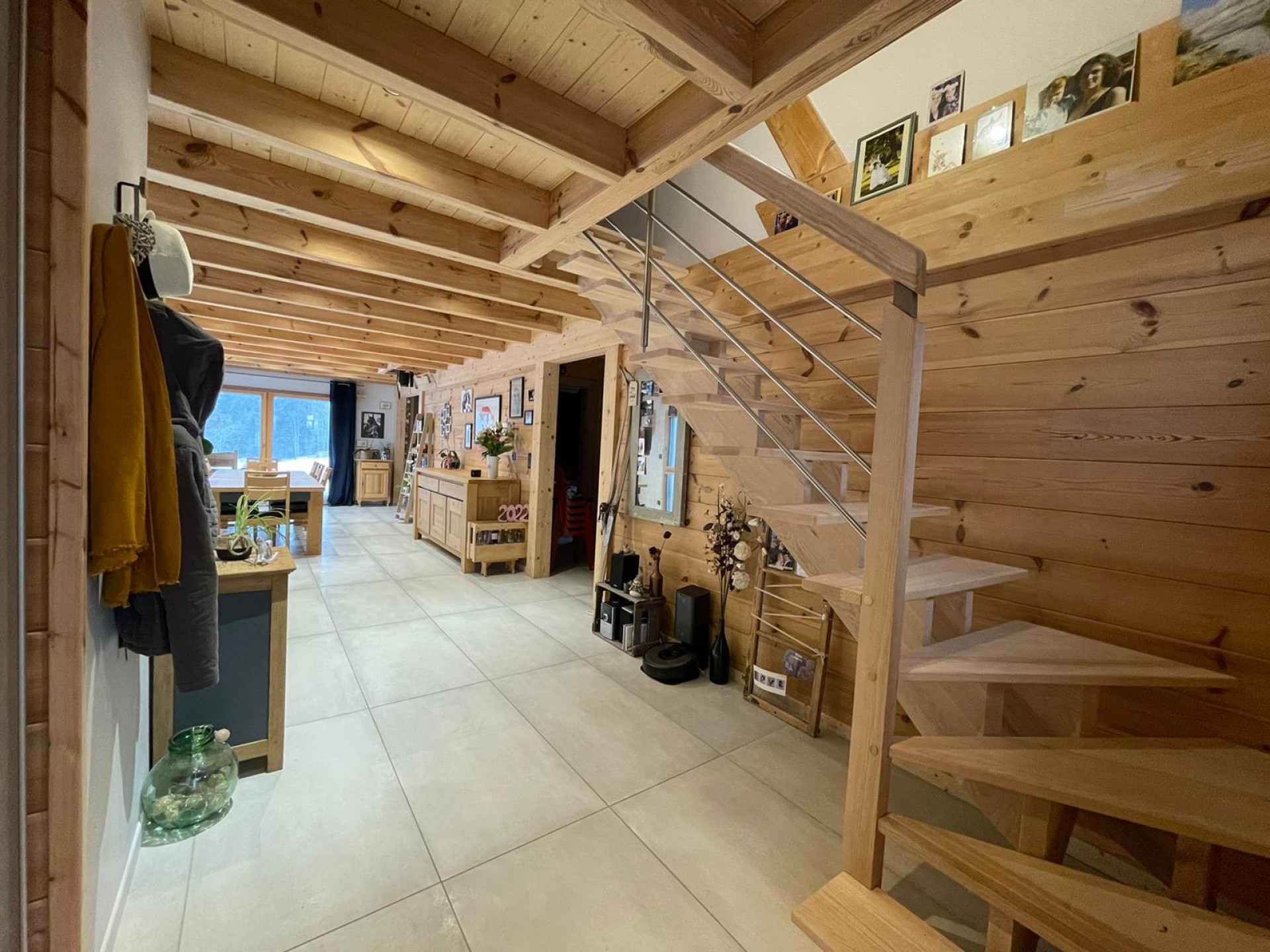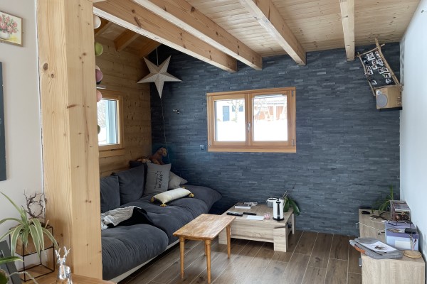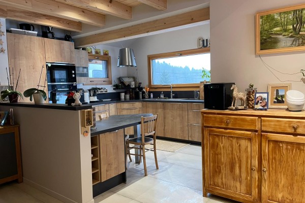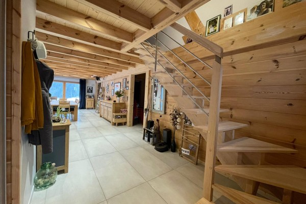 Ce beau chalet en madriers avec menuiseries extérieures en bois-alu gris clair, alliant tradition et modernité, est composé d’un séjour de 27 m2, d’une cuisine de 12 m2 ainsi qu’un salon de 13 m2. Nous avons également au rez-de-chaussée une chambre, une buanderie et une salle de bain avec des toilettes séparées. Nous retrouvons également un grand garage de 50 m2.