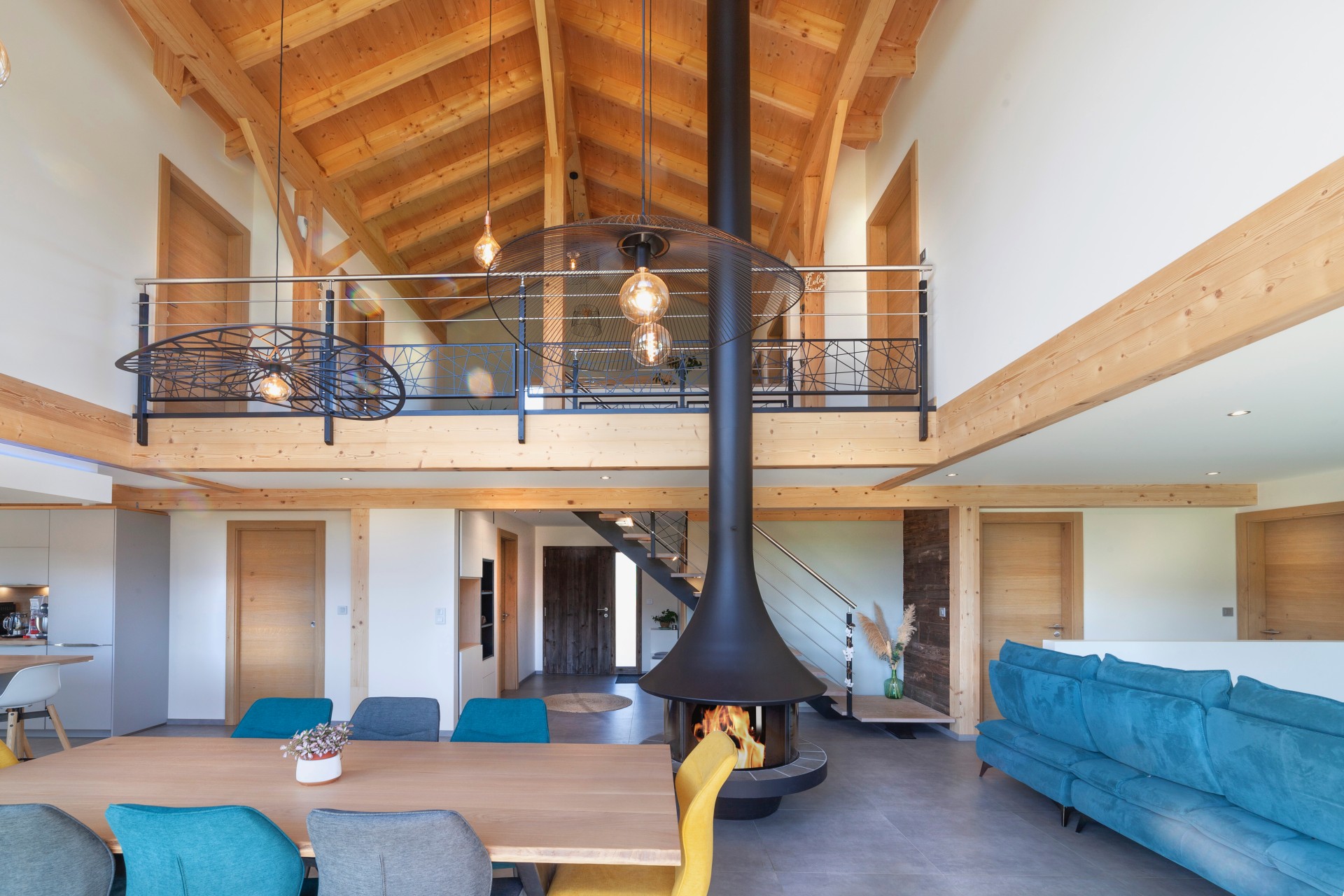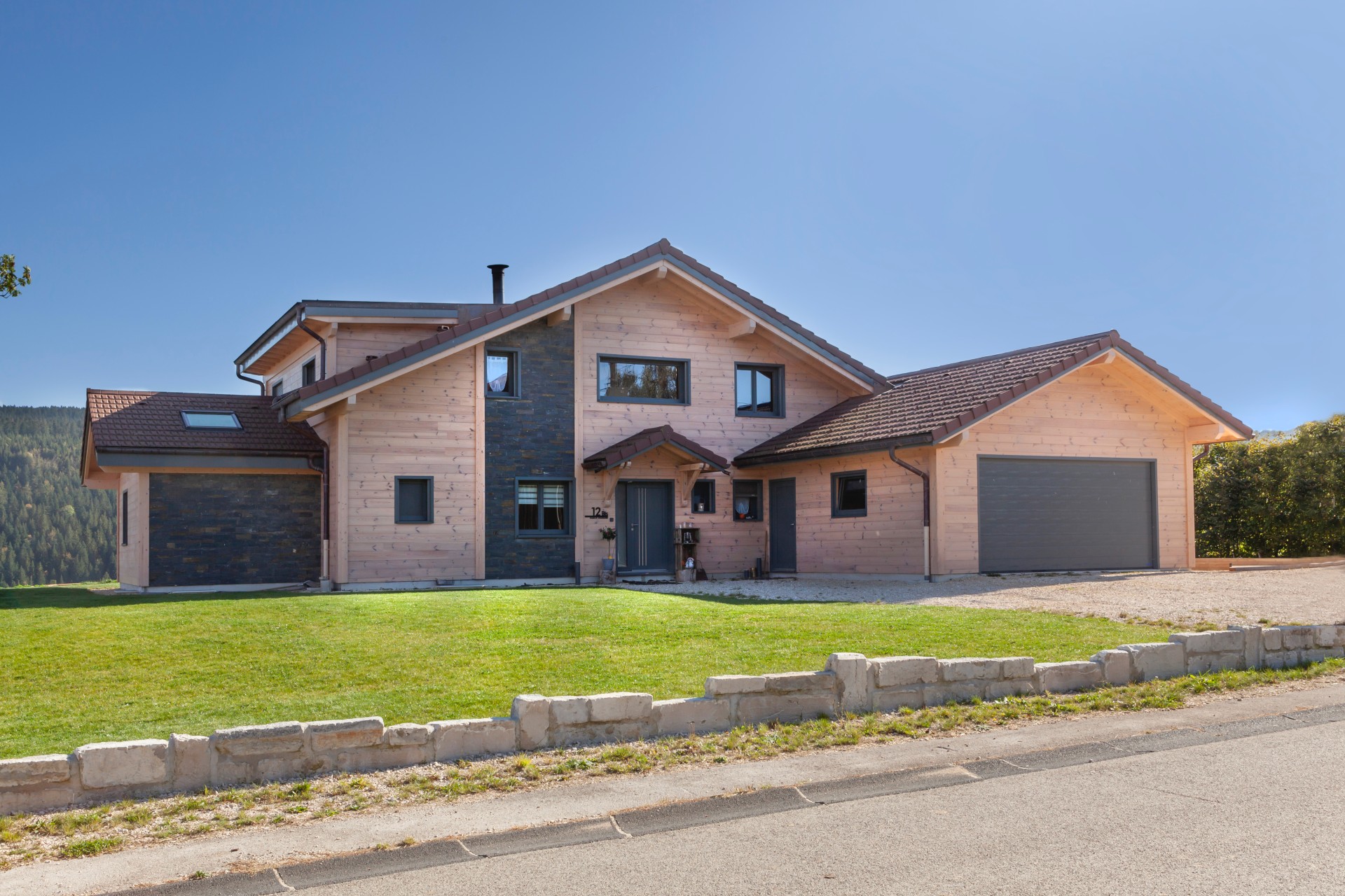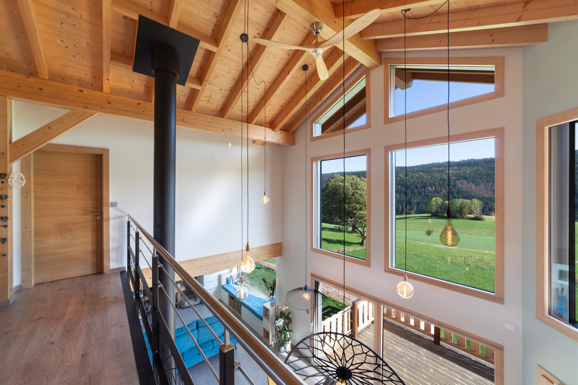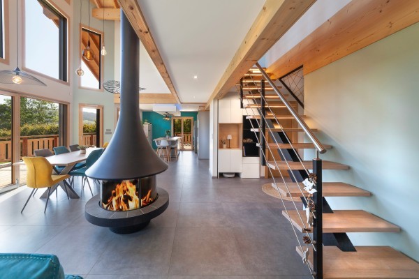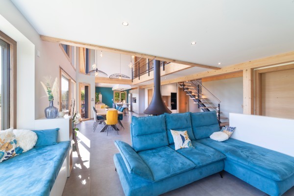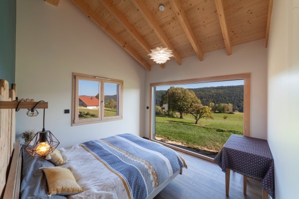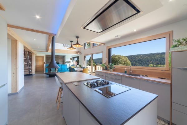 Cette belle maison bois contemporaine possède de grandes ouvertures sur l'espace séjour et mezzanine, permettant d'avoir une luminosité sans pareille dans les pièces à vivre et de profiter de la vue sur les paysages franc-comtois.
