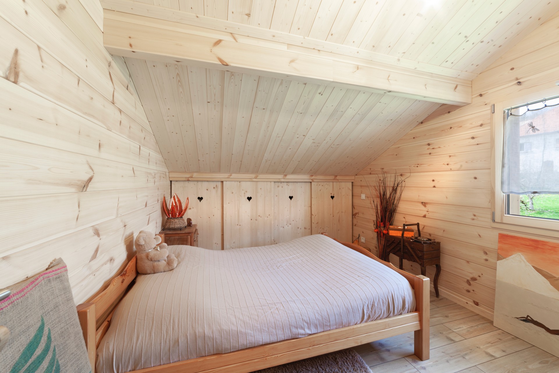 De la livraison de kits à clés en mains, Finn-est assure toutes les finitions comme la découpe des volets bois en forme de cœur dans ce chalet.